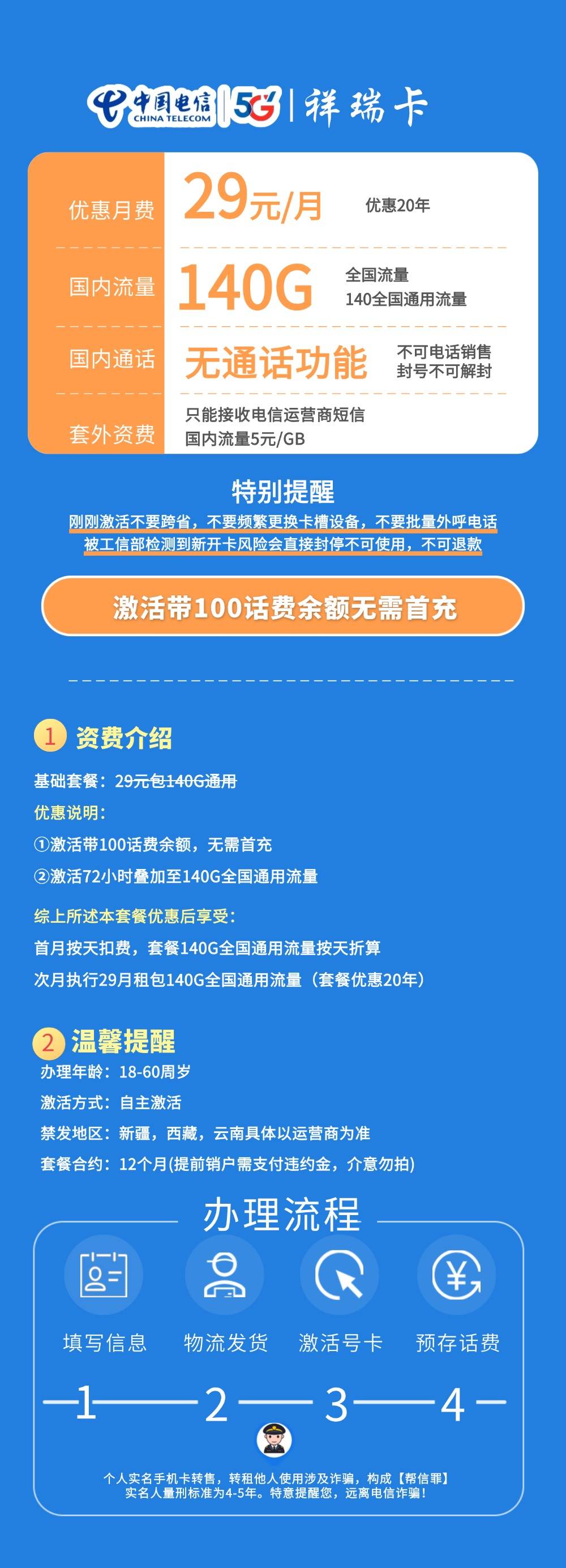 电信祥瑞卡29包140G全国通用流量