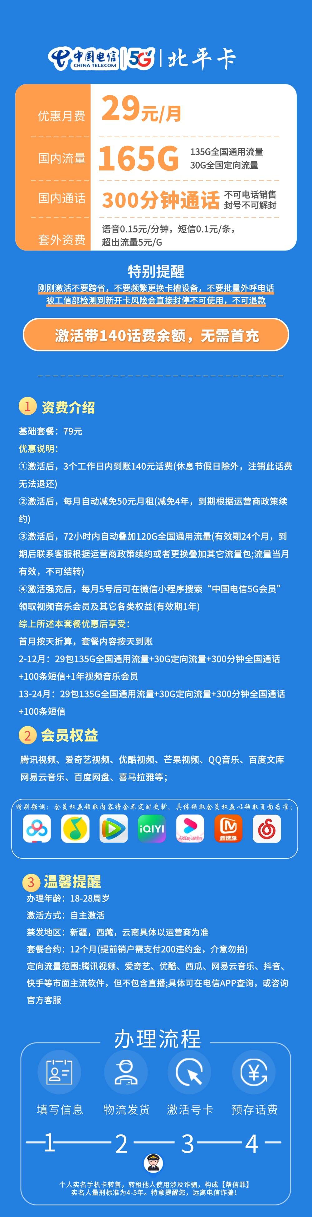 电信北平卡29包135G全国通用流量+30G定向流量+300分钟+一年会员