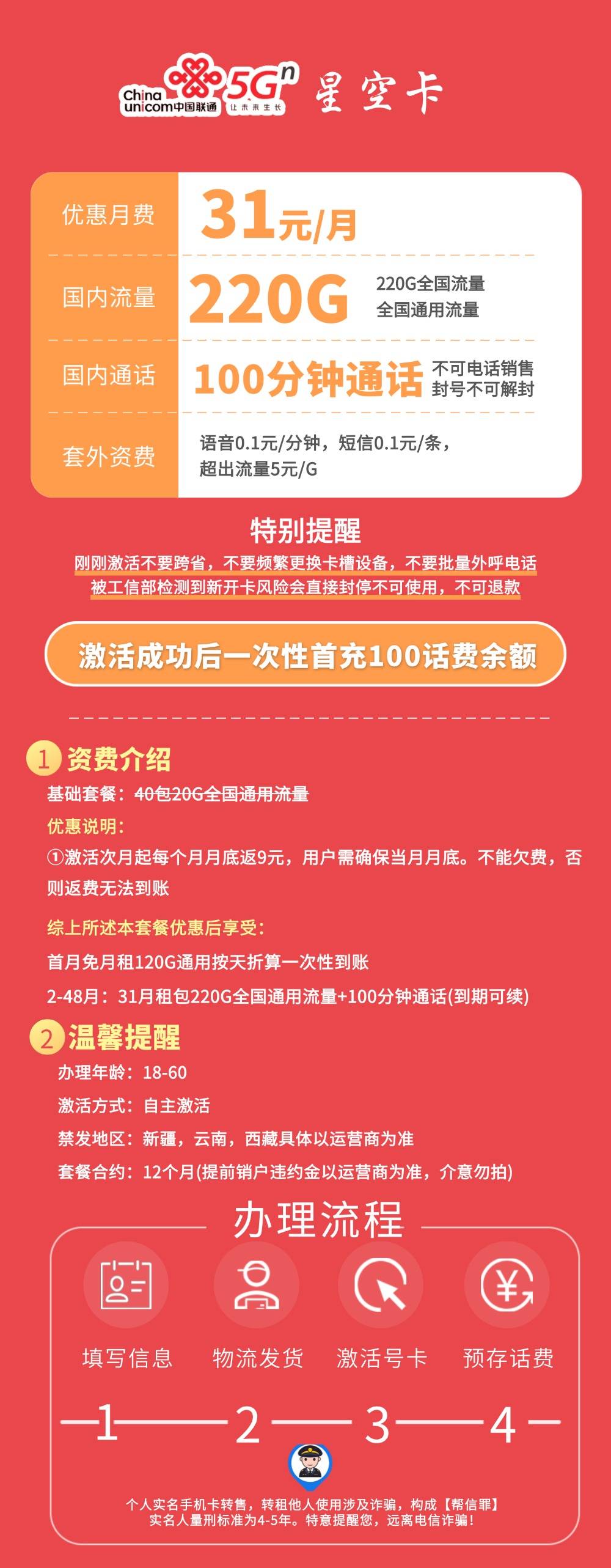 联通星空卡31包220G全国通用流量+100分钟通话